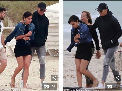 With temperatures dropping to an unseasonable 15 degrees on the Balearic party island, Ronaldo, 33, wrapped up in a thick hooded top as they made their way across the beach.