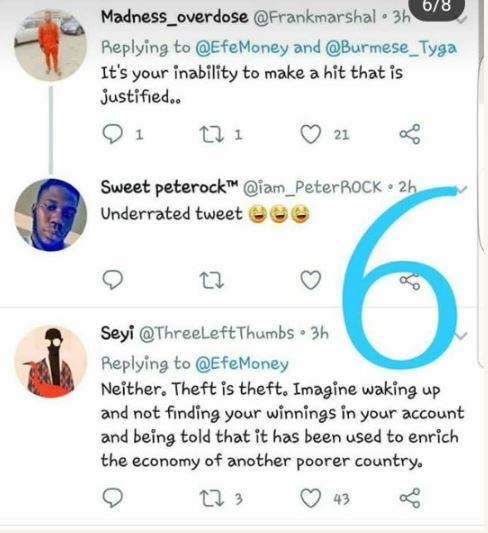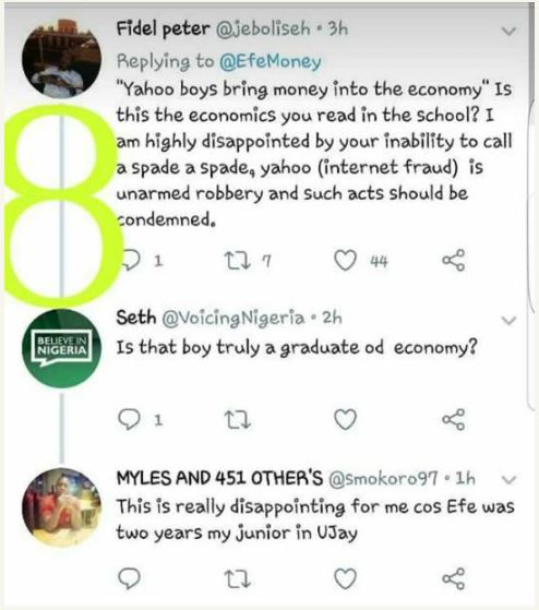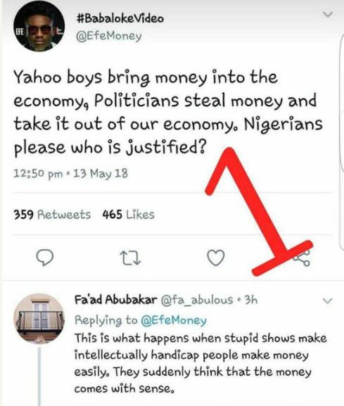 In his words, "Yahoo boys bring money into the economy, Politicians steal money and take it out of our economy. Nigerians please who is justified?"