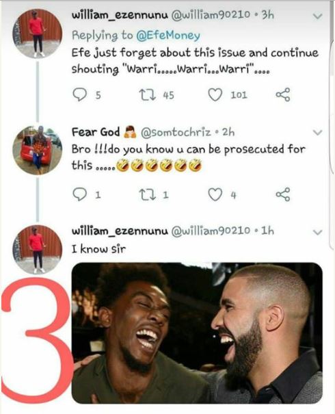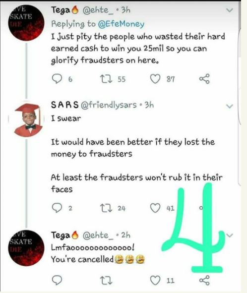 This sparked arguments on social media with some people for the alleged yahoo boys and others, against them. BBNaija 2017 winner, Efe, also aired his opinion on the issue and it didn't sit well with people who felt he was in support of these criminals.
