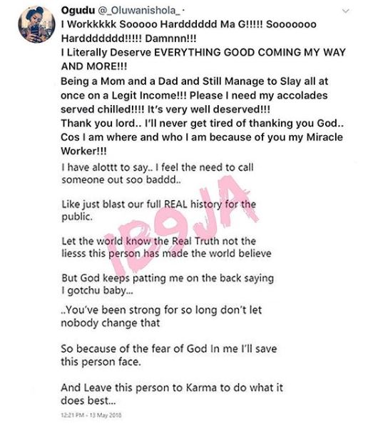 According to OluwaniShola, she has being a mother and father to their son all by herself. She has called on Nigerians to give her some accolades for her struggles.