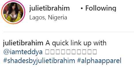 In this new photo which was shared by Juliet Ibrahim herself, the lady explained that she is just having  a "quick link up with Teddy A"