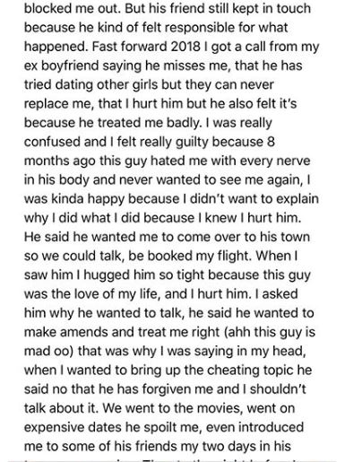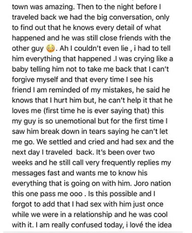 A woman has been left flabbergasted after ex-boyfriend whom she cheat on returned to her for a serious relationship.