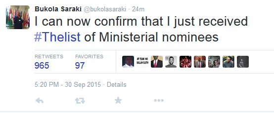 Senate President, Bukola Saraki, has taken to his official Twitter page to announce that he has finally received the much anticipated list of ministerial nominess from Nigerian President, Muhammadu Buhari.