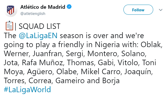 “The LaLiga season is over and we’re going to play a friendly in Nigeria with: Oblak, Werner, Juanfran, Sergi, Montero, Solano, Jota, Rafa Muñoz, Thomas, Gabi, Vitolo, Toni Moya, Agüero, Olabe, Mikel Carro, Joaquín, Torres, Correa, Gameiro and Borja,” Atletico wrote on their handle.