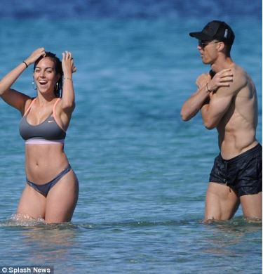 The sportsman, 33, and his partner, 24, looked very much in love as they kissed and cuddled in the water, while larking around with his eldest son, Cristiano Jnr, seven.