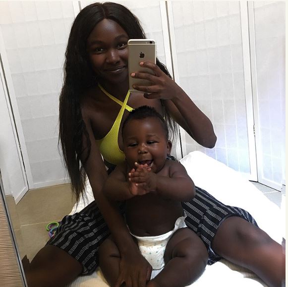 At a period when people bleach that skins to make it appealing to the outside world, a woman is showcasing the dark skin of her child.