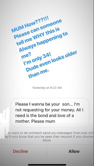 Tboss whose real name is Tokunbo Idowu revealed that she got a request from the man asking her to be his mother. This horrified her because according to her, the man who is apparently full-grown, even looks older than her.