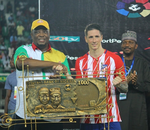 Meanwhile, former Liverpool star, Fernando Torres was later presented with a special gift - a Gold sculptured N1000 note - to celebrate his final game for Atletico after the match.