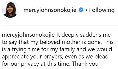 Nollywood actress, Mercy Johnson, has lost her mom, Mrs Elizabeth Johnson.