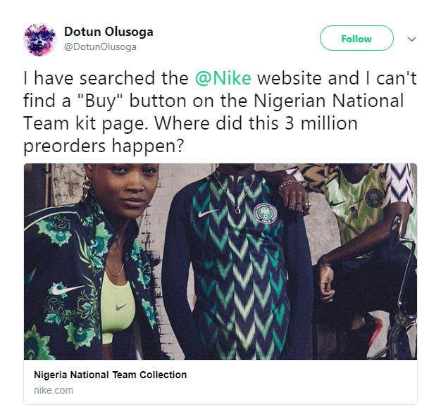"I have searched the @Nike website and I can't find a "Buy" button on the Nigerian National Team kit page. Where did this 3 million preorders happen?"