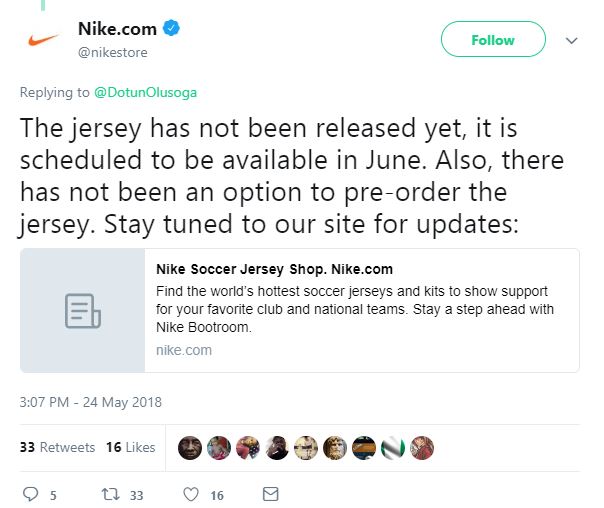 "The jersey has not been released yet, it is scheduled to be available in June. Also, there has not been an option to pre-order the jersey. Stay tuned to our site for updates" the company reacted to an inquiry made by a potential Nigerian buyer, Dotun Olusoga via Twitter.