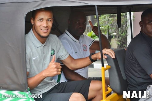 Troost Ekong rides in a tricycle painted in colours of Super Eagles jersey (Photo: Emmanuel Osodi for Naij.com)