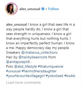 "I know a girl that sees life in a way people hardly do. I know a girl that sees strength in uniqueness. I know a girl that everything hurts but nothing hurts. I know an imperfectly perfect human. I know a me. Happy democracy day my people," she posted for her close to 600, 000 followers on Instagram.
