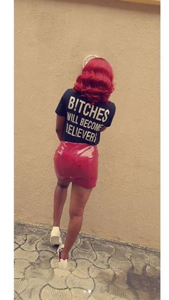 "B!tches will become believers" was the inscription on the back of the shirt worn by Alex who has been romantically-linked her former strategic partner, Tobi.