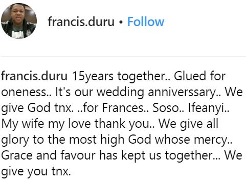 He wrote: "15 years together.. Glued for oneness.. It's our wedding anniversary.. We give God tnx. ..for Frances.. Soso.. Ifeanyi..