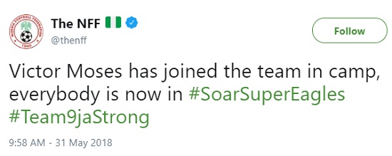 The football body stated that the Eagles players are all in camp now. “Victor Moses has joined the team in camp, everybody is in now,” the NFF tweeted.