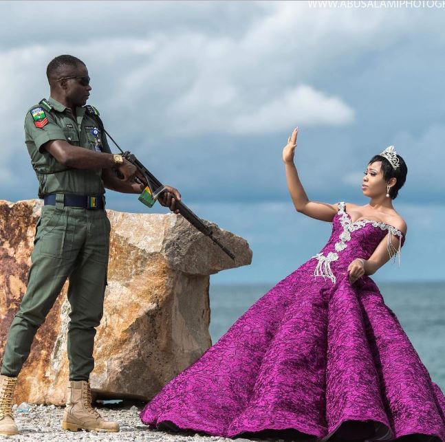 She spiced up her picture with a subtle political message to express her stand against oppression and other ills battling the Nigerian state. A policeman was spotted trying to harm her with his gun at a beach environment.