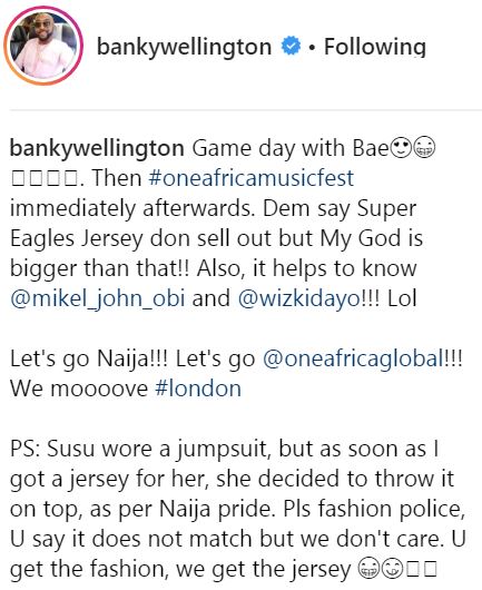 Banky W shared the photo seen above showing himself and his wife rocking the new Super Eagles Jersey as they prepared to watch the match live.
