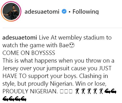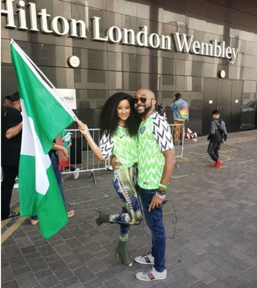 Banky W and Adesua Etomi, one of Nigeria's best known celebrity couples, were in London to watch the Three Lions of England take on the Super Eagles of Nigeria in an international friendly yesterday at the Wembley Stadium.