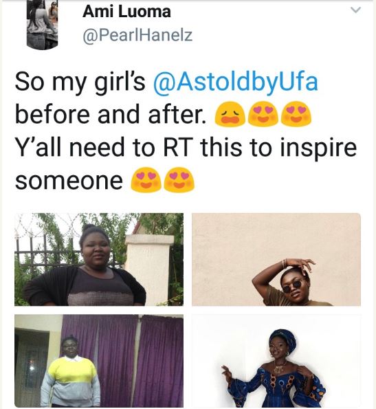 "So my girl’s @AstoldbyUfa before and after. Y’all need to RT this to inspire someone.