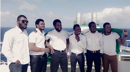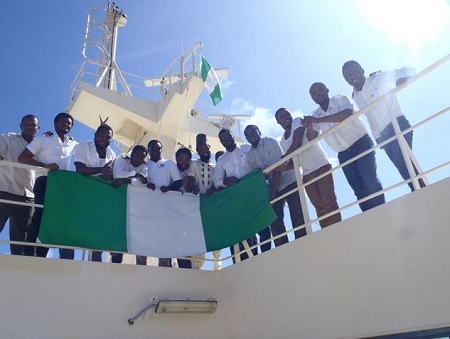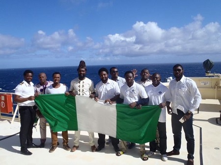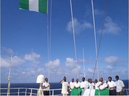 A group of Nigerian sailors at sea took a break to mark Nigeria's 55 anniversary yesterday in bold colours with the Nigerian flag soaring high.