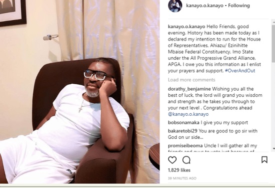 Veteran Nollywood actor, Kanayo O. Kanayo, has taken to his Instagram page to announce his intention to run for a seat in the Federal House of Representatives in 2019.