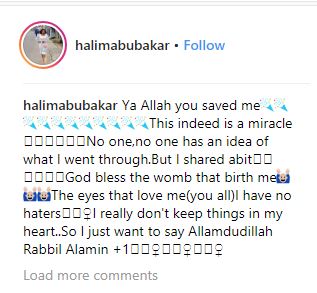 She wrote; "Ya Allah you saved me This indeed is a miracle.No one,no one has an idea of what I went through.But I shared abit. God bless the womb that birth me The eyes that love me(you all)I have no haters. I really don't keep things in my heart..So I just want to say Allamdudillah Rabbil Alamin +1"