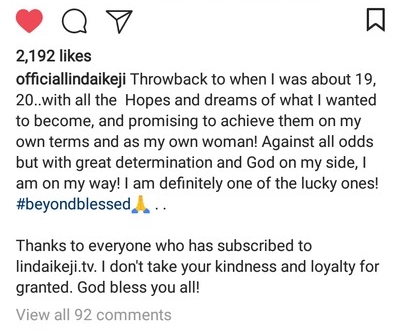 "Thanks to everyone who has subscribed to lindaikeji.tv. I don't take your kindness and loyalty for granted. God bless you all!"