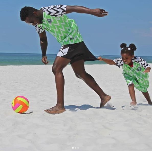 Both parties were seen joyfully kicking the ball around on the beach as the kid flaunted the Nigerian green and white flag.