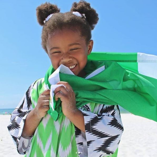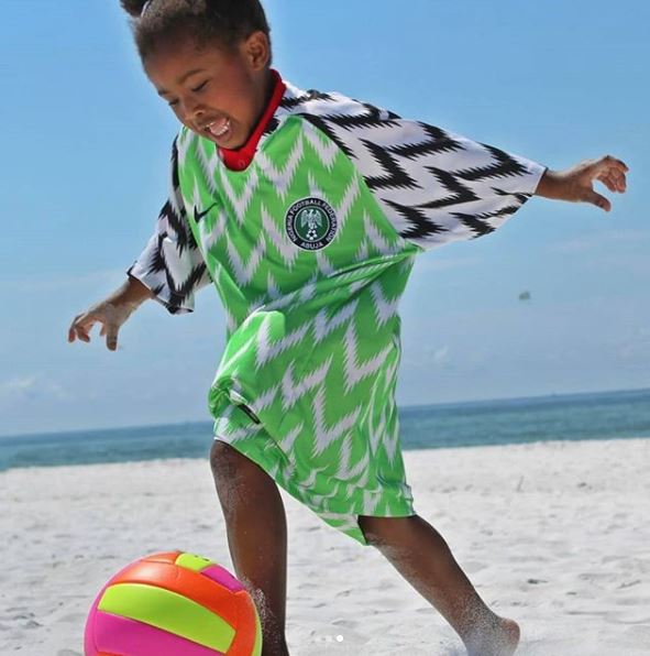 Beat FM Lagos OAP, Osi Suave has shared photos of his adorable niece playing football on a beach wearing the pricey but oversized Super Eagles jersey,.