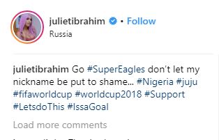 She wrote "Go SuperEagles, don't let my nickname be put to shame"