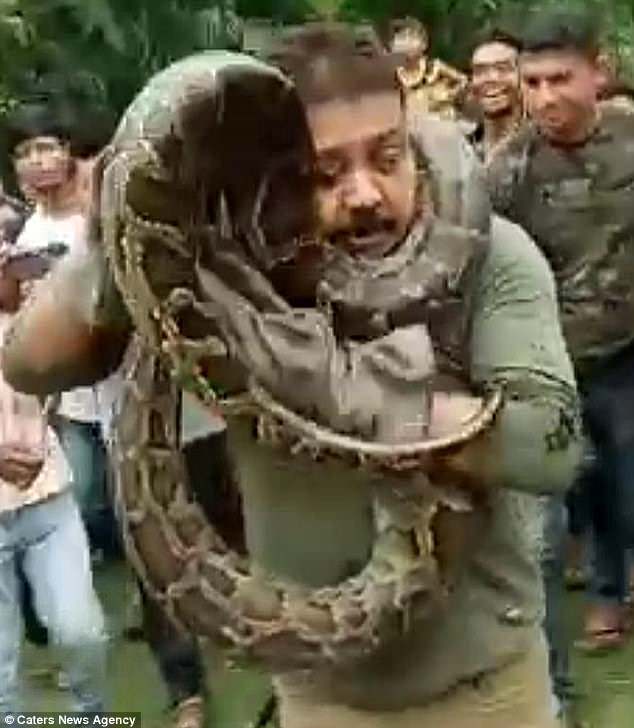 After capturing the serpent, Mr Dutta put it over his shoulder while a crowd of people posed for a photograph with him.