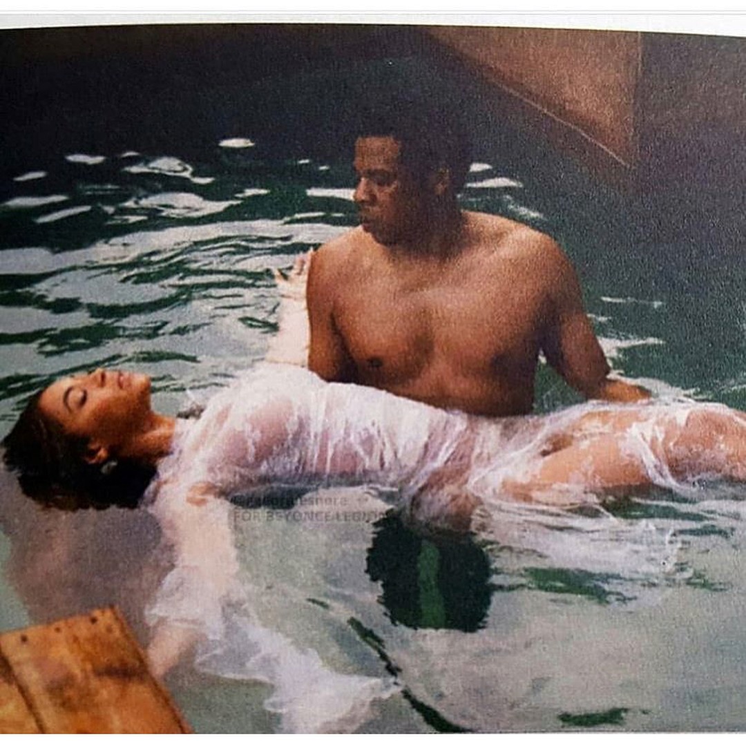 The images show Beyonce and Jay Z mimicking traditional Christian imagery. One of the images shows Beyonce dressed as if she were Jesus and there's a cross around her, while the second image shows Jay Z as John The Baptist, baptizing Beyonce.