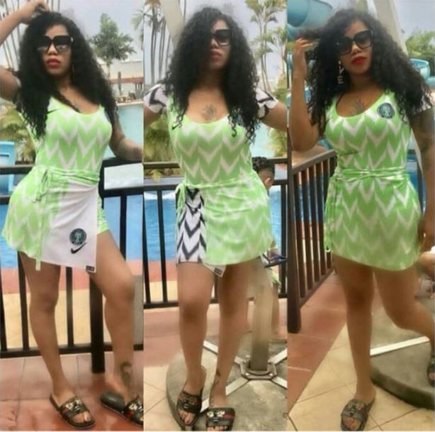 Different versions of the the Super Eagles World Cup jersey in Russia have been popping up, and this lady just rocked her own as skirt and blouse as she poses by the pool side.