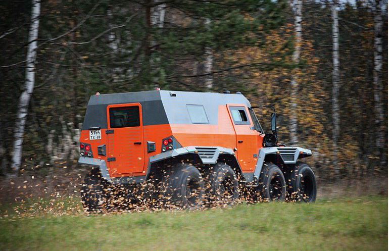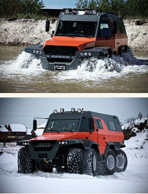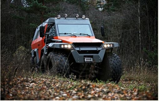 The 8-wheel drive Avtoros Shaman will tackle any terrain known to mankind ,from land to snow and even cruise easily through water. Each of its eight wheels can drive and steer independently.