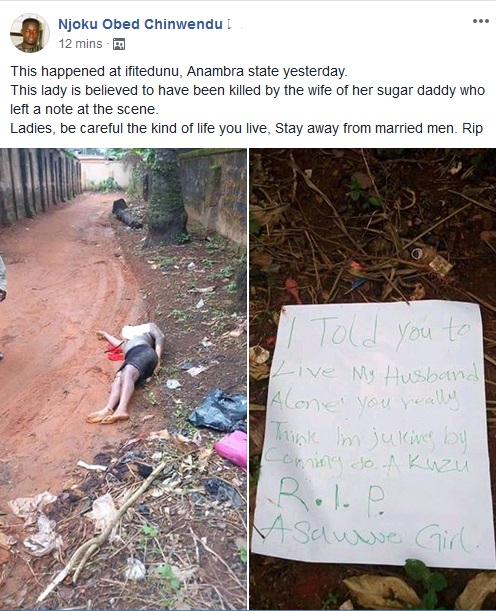 According to Njoku Obed Chinwendu who shared the news on Facebook, a warning note was left at the scene where her corpse was laid.