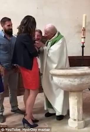 The child's relatives still appear to be smiling as the priest brings the baby's head towards his, but the baby reacts badly and flails its right arm towards the woman. As it carries on crying the priest says: 'Calm down, calm down, you must calm down.'