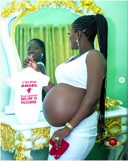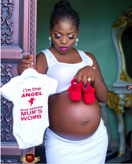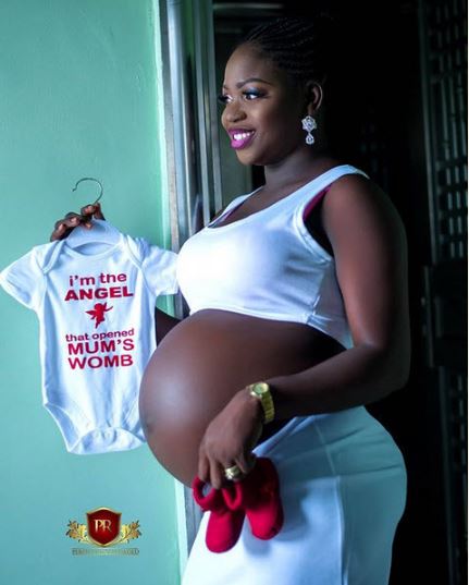 She poses with shirts and shoes for her unborn child. This has been described as adorable with several women set to imitate her action.