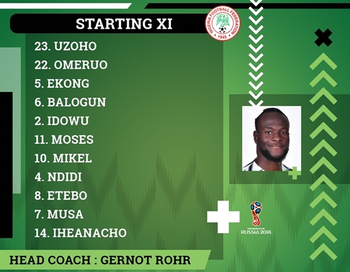 Starting line-up and squad list for the World Cup Group D match between Nigeria and Iceland in Volgograd, Russia on Friday have been released.
