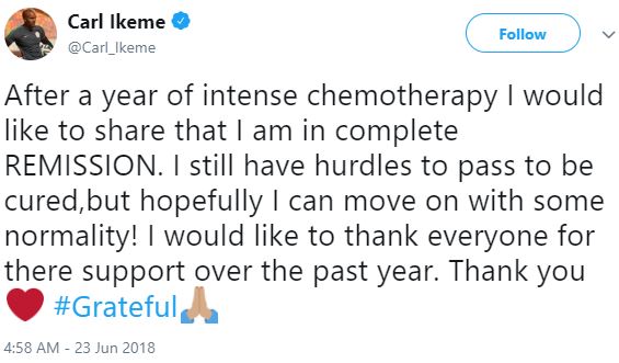 Ikeme shared the news on his Twitter handle, writing; “After a year of intense chemotherapy I would like to share that I am in complete REMISSION.”
