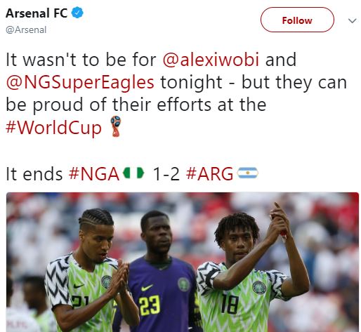 “It wasn’t to be for Alex Iwobi and Super Eagles tonight but they can be proud of their efforts at the World Cup,” Arsenal tweeted.